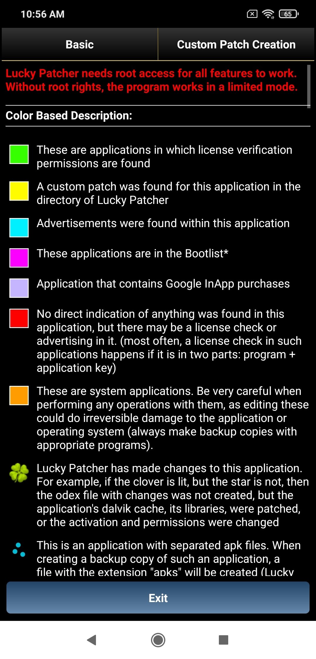 Una vez creada la lista de las aplicaciones, verás que, como decíamos, cada una aparece destacada con un color o icono. Este es el significado de los colores de Lucky Patcher (y de los iconos):