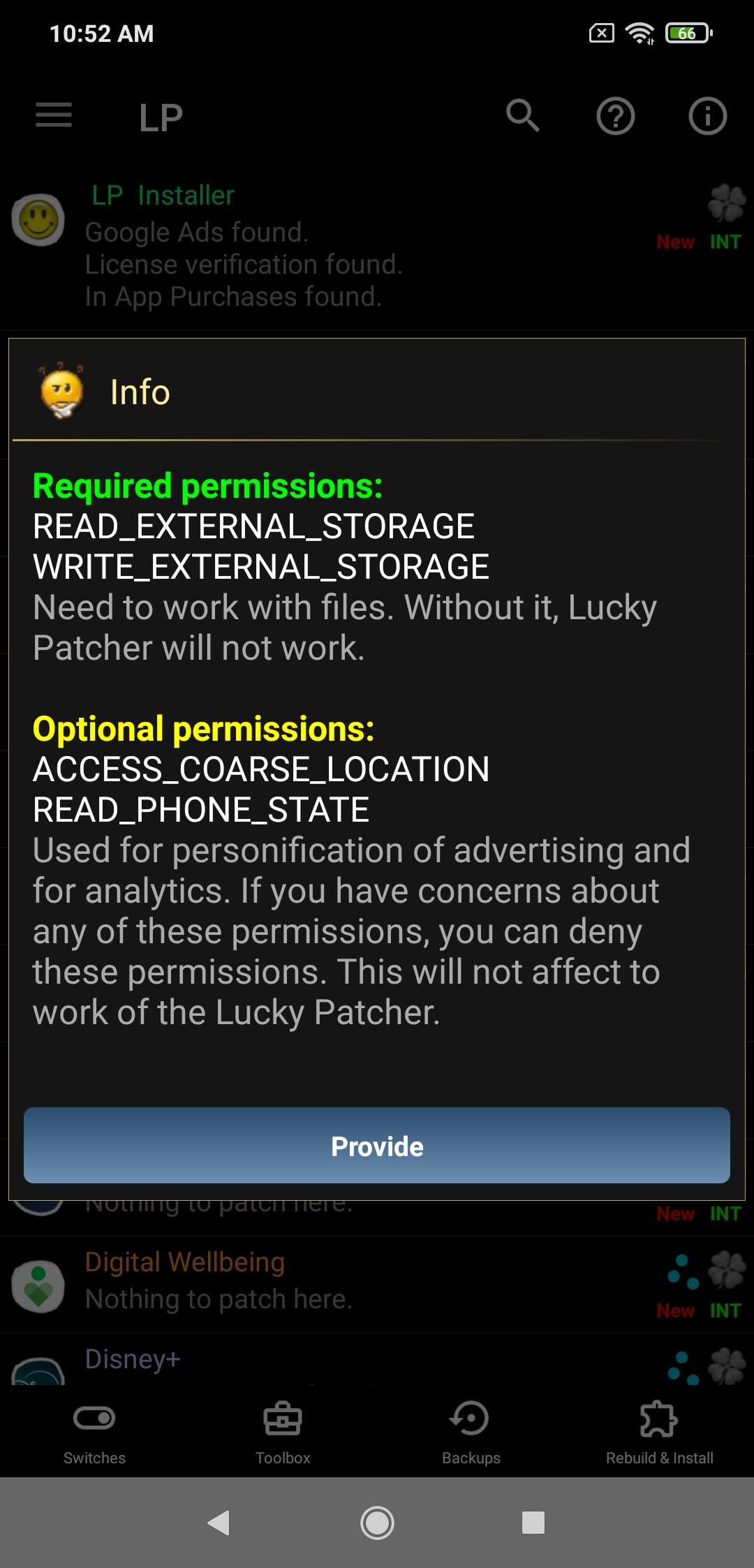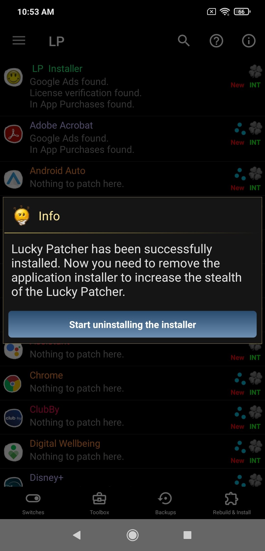 - Una vez instalada, abre la app de Lucky Patcher y desinstala el instalador.